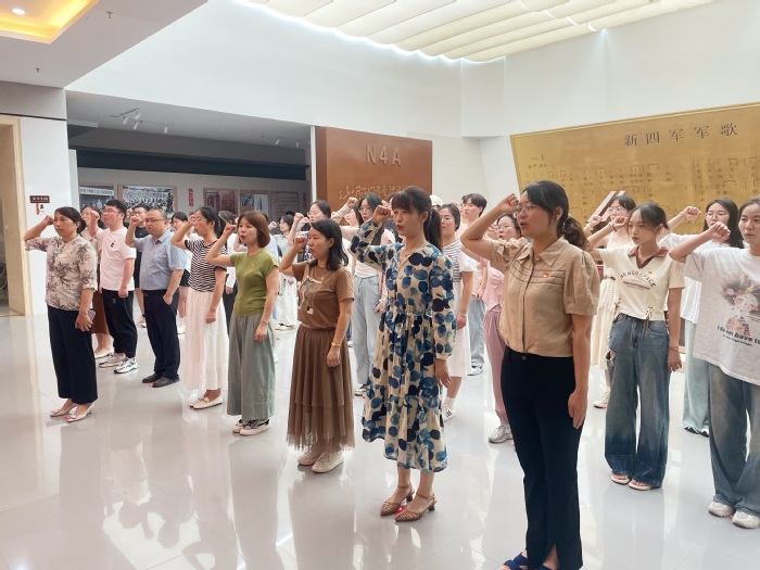 新四军第七师纪念馆展馆共设“皖江抗日起怒潮”“血泊中诞生的新四军第七师”“第七师健儿驰骋皖江”等8个展厅,师生党员从一幅幅珍贵的历史图文、一件件实物用品、一幕幕战斗场景中,重温新四军第七师从创建、巩固到发展、壮大的光辉历程,深刻感受革命先辈对党忠诚、信念坚定的崇高风范和不怕牺牲、英勇抗战的革命精神。站在鲜红的党旗面前,全体师生党员们重温了入党誓词,以铿锵有力的誓言再次坚定了初心和使命。