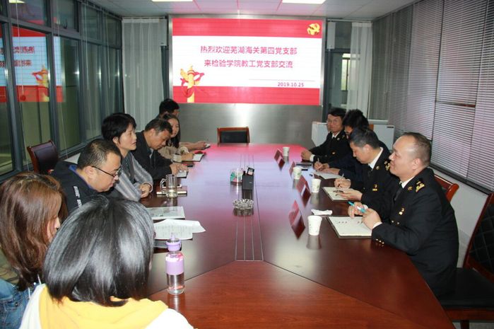 党支部交流相互学,经验分享共提升。为积极推进党建和业务深度融合,使“抓党建促发展、双提升双融合”落地生根,实现党建工作与业务工作双促进、共提升,10月25日,芜湖海关第四党支部书记胡家春,委员先裕飞、徐伟等一行来我院教工党支部开展支部共建交流学习活动。学院党总支书记、副院长崔晓霞,副院长浦春,教工党支部书记孙恩涛和教工支部全体党员参加了交流活动。