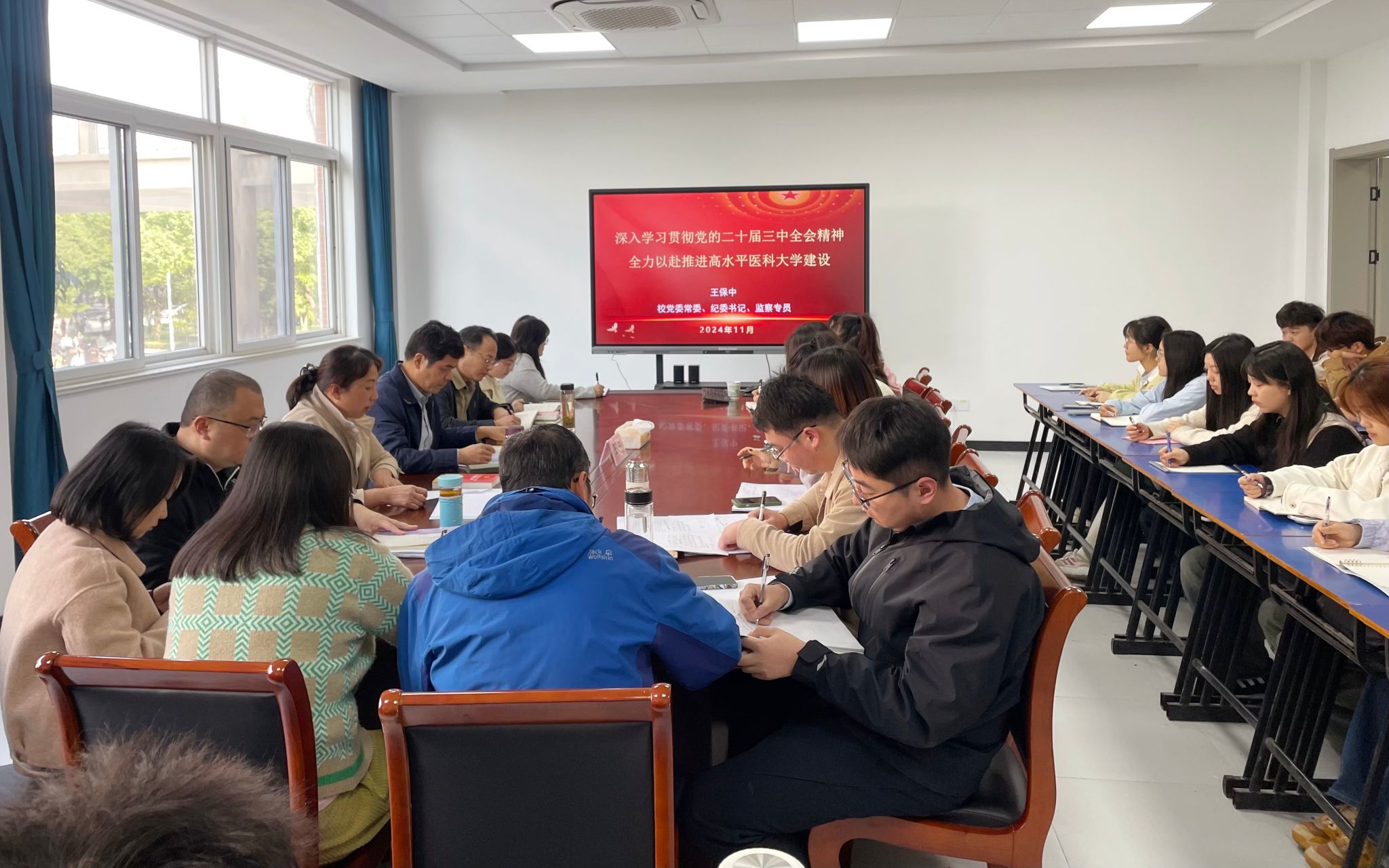 王保中以《深入学习贯彻党的二十届三中全会精神 全力以赴推进高水平医科大学建设》为主题,从“深入理解把握党的二十届三中全会的重大意义与深远影响”、“深入学习领会习近平总书记在全会上的重要讲话精神”、“全力以赴贯彻落实全会精神和习近平总书记考察安徽重要讲话精神”三个方面进行了深入地阐述。他指出,党的二十届三中全会是新的历史起点上进一步全面深化改革、推进中国式现代化的总动员、总部署,是面对纷繁复杂的国际国内形势,面对新一轮科技革命和产业变革,面对人民群众新期待召开的一次重要会议。会议提出一系列改革措施,对党的二十大提出的目标进行了具体化和深化,明确了深入推动中国式现代化实现高质量发展的方向和举措。