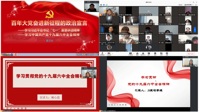 百年征程波澜壮阔,百年奋斗成就辉煌。为学习贯彻党的十九届六中全会精神,深入领会其精神内涵,我院于2022年1月7日至8日开展线上宣讲活动。此次宣讲由我院团委书记曹玉祥、校团委学生宣讲团成员李婕和阚心蕊主讲,我院全体团员青年和第十三期青马班成员参加。