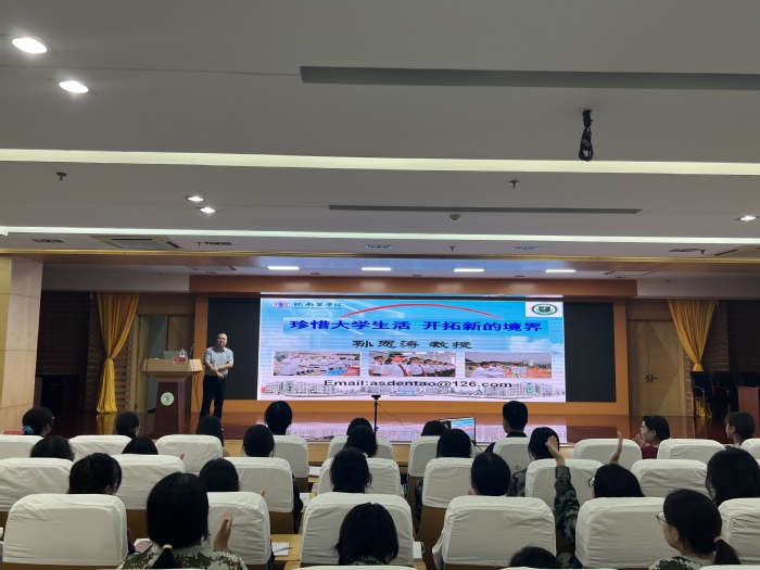 校“十佳教师”孙恩涛从个人学习经历、“晨馨”科研创新团队、优秀学子事迹介绍三个方面,向新生讲解了美好的大学生活应如何充实度过,鼓励大家从榜样身上汲取奋进力量,找准人生定位,掌握正确学习方法,努力成长为优秀的检验人才。