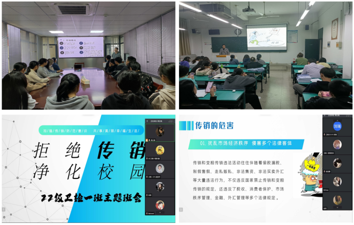 为强化学生对传销的防范意识,提高对传销的识别能力,筑牢思想道德防线,我院各班宣传委员以“拒绝传销 净化校园”为主题,召开了一次主题班会。各班宣传委员结合传销案例,详细介绍了传销的惯用手段和常见骗局,强调了传销所造成的恶劣影响和参与传销应担负的法律责任,告诫同学应增强自我防范意识,自觉远离传销、坚决抵制传销。
