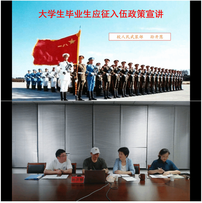 会议伊始,现就读于复旦大学附属中山医院骨外科专硕研究生的优秀退役学生代表王汉全介绍了自己在校、参军入伍和考研等经历,与在场同学分享了在部队的成长与收获,并号召同学们积极应征入伍,到部队去锻炼自己、成就自己。孙开慧为同学们重点解读了国家、芜湖、学校的征兵政策,从报名条件和程序、优待政策、成才成长等方面对征兵工作进行了详细介绍,表示党和国家为我们创造了今天的幸福生活,我们要为祖国的未来发展和国防安全做出贡献,树立保家卫国的伟大理想信念,积极应征入伍。座谈交流环节,孙开慧帮助有意向的同学进行了答疑解惑。
