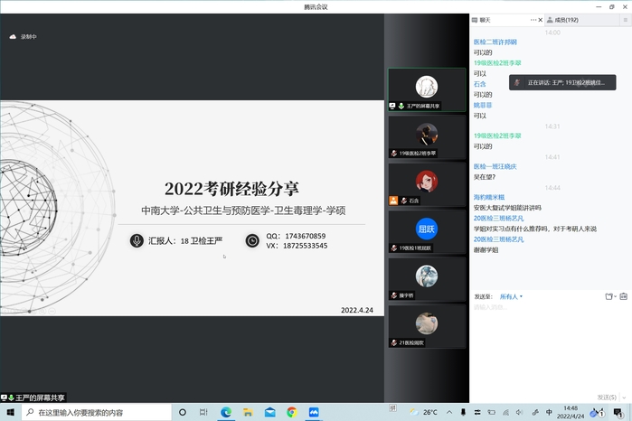 传递梦想,举办考研交流会。化茧成蝶凯旋回,研途心得解迷津。为增强同学们对研究生入学考试的认识,提高学生考研热情,进一步明确考研目标,掌握相关考研技巧,4月24日下午,我院通过腾讯会议举办2022年考研经验分享交流会,7名2018级考研优秀学子应邀分享经验,学院200余名学生参加交流会。