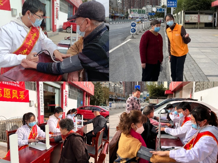 志愿者们满腔热忱地来到社区门口,分成三个小队进行志愿活动。第一队在社区门口摆好义诊台和血压计,在志愿者的宣传和引导下,来往的路人纷纷来到义诊处量血压;志愿者们细心地询问老人身体情况、吃药情况等,并对血压和身体基本情况进行了详细记录,面对血压偏高或偏低的老人,志愿者贴心地嘱咐他们要按时吃药、定期就医、放平心态,建议他们清淡饮食,多做运动,志愿者们的笑容也让他们更加安心。