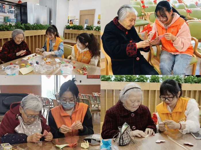 欢乐手工,亲近“夕阳”。在现场手工制作环节中,志愿者与老人们一起制作不同款式的折纸作品,在折纸的乐趣中放飞自我。期间大家畅所欲言,彼此聊起了家常和生活趣事,不少老人分享了自己的过往经历,鼓励志愿者们奋发图强、报效祖国。