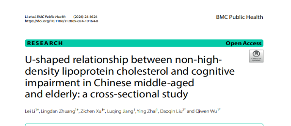 2024618日,我院临床微免教研室武其文教授课题组在《BMC Public Health》发表题为《U-shaped relationship between non-high density lipoprotein cholesterol and cognitive impairment in Chinese middle-aged and elderly: a cross-sectional study》(中科院二区,Top期刊)学术论文