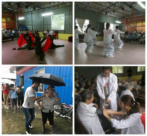 在孚玉镇亲情养老院,队员为老人们义务测量身高体重、量血压,讲解夏季防暑医学小常识,解答有关医疗知识。并赠送了防暑降温、防治蚊虫叮咬药物。随后,由艺术团骨干们组成的我院“萤火虫”志愿队员们为老人们带来一场别开生面的文艺表演。表演包括民族舞串烧、红歌串烧、年代舞芳华、太极拳、小合唱等。特别是小合唱环节,老人们高兴地与同学们一同拍手哼唱,现场气氛非常活跃。