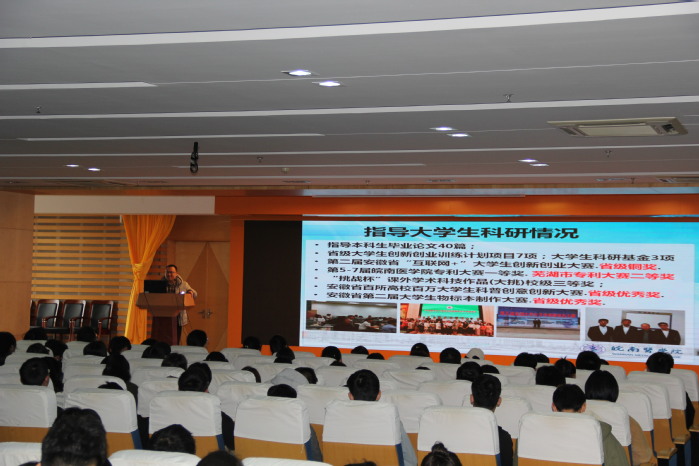 为培养大学生科研创新意识,提高大学生参与科研兴趣小组及创新学习的积极性。2019年3月16日上午十点,我院在图书馆三楼报告厅举办了“大学生科研创新项目思维培训与交流”的讲座,讲座由皖南医学院第二附属医院科研中心唐晓磊博士和我院卫生检验与检疫教研室主任孙恩涛主讲,我院团委副书记曹玉祥主持,我院2017级、2018级全体同学参加了本次讲座。