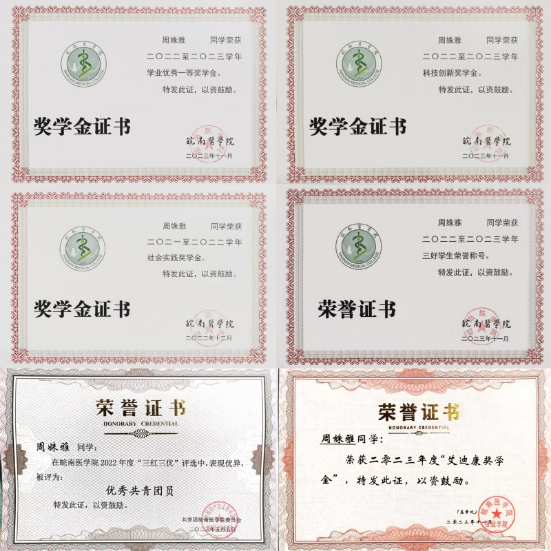 少年何妨梦摘星, 敢挽桑弓射玉衡。自进入大学以来,周姝雅同学一直把“一分耕耘,一分收获”当作自己的座右铭,深知作为一名医学生的责任与担当,明白只有踏实肯干才能取得一番成绩。因此,她在学习上要求进步、从不松懈。大一和大二学年学业成绩均位专业第一,两学年她获得7项奖学金,10项荣誉称号。同时她深知英语学习的重要性,着力于提高英语水平,大一大二积极报名四六级,并取得四级617分、六级544分的成绩,2023年全国大学生英语竞赛三等奖。