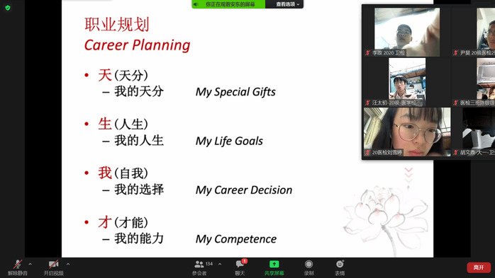 刘沁从“天、生、我、才”四个方面对如何正确规划未来职业进行分析,借助“工作、“职业”、“人脉”、“他人影响”四个角度对职业规划的理解、看法、态度、做法进行讲解,同时通过观看小视频、组内讨论交流“对自己工作影响人物”等线上互动来帮助同学们对职业规划更深入的了解。最后,刘沁鼓励同学们从当下开始做好自己,认真思考未来,不负韶华,最终成就更优秀的自己。