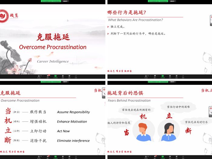 为让学生科学掌握克服拖延症的方法,同时进一步提升同学们的时间管理能力以及做事效率,11月19日晚,我院通过网络会议的形式,邀请北京职慧公益创业发展中心的陈欣老师开展了“克服拖延”主题讲座。学院团委书记曹玉祥及106名学生参加讲座。