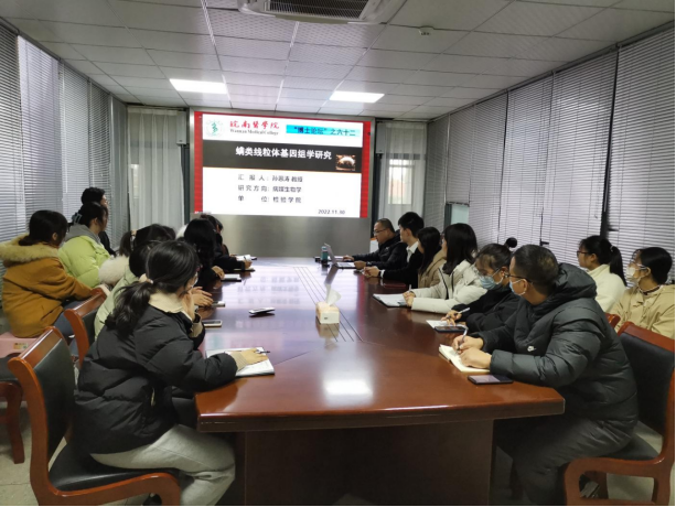 孙恩涛博士作题为“螨类线粒体基因组学研究”的学术讲座。他首先介绍了螨类线粒体基因组学研究现状和存在问题,从线粒体基因组的一般结构及基因重排、蛋白质编码基因、rRNA基因、tRNA基因、控制区、系统发育关系等六个方面对螨类线粒体基因组进行阐释,详细梳理了本课题组近年来报道的无气门股螨类线粒体基因组全序列的基因特征和系统发育关系等,细心分享了研究内容、研究成果及研究展望。整场报告思路清晰,精彩生动。