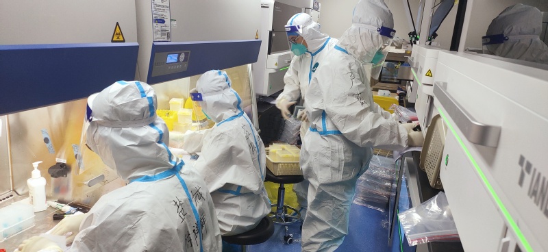 在实验里,面对成千上万堆叠的样本,陈祥祥有条不紊地工作着。取样本、开盖、加枪头、吸样、加样、闭盖、打掉枪头、放回样本,看似简单的步骤反复做上几千遍让人十分疲惫,长时间保持一个姿势也令人腰酸背痛,因为反复加样,手指磨破了皮,但他依然坚持着。为了快速完成样本检测,他们更是争分夺秒,在这6个小时里,甚至连厕所也不敢上,水也敢不喝。为什么呢?“穿脱防护服有很多步骤和注意事项,一穿一脱再上个厕所十几分钟就没了,而这段时间我们可以完成近200份的样本检测工作。”陈祥祥说,因此他们尽量少去、甚至不上厕所。