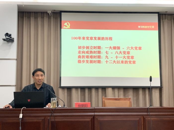 徐朝阳从党章的发展历程、党章的体例结构、学习和遵守党章三个方面展开宣讲。以100年来党章的发展历程为切入点,讲述了共产党百年奋斗的光辉历程和伟大贡献,引导学生学史明理、鉴往知今,学史增信、信仰坚定,学史崇德、修德养性,学史力行、放飞梦想。通过对一大到十九大的党章修改的历史回顾、通过对近代史、新民主主义史、社会主义发展史到新时期历史的伟大斗争的生动讲述,深刻剖析还原了我们党从创立、斗争、探索到进入新时代的百年奋斗历程。