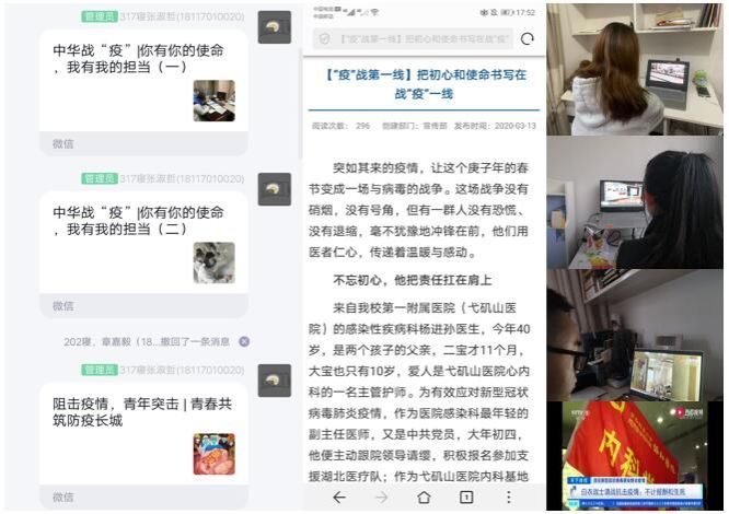 新型冠状病毒疫情爆发以来,无数党员和先进工作者主动请缨前往防疫第一线,用生命坚守岗位,尽己所能救死扶伤,他们是最美的“逆行者”。这里面不乏有我校第一附属医院和第二附属医院的优秀医护人员,同样也有我校甚至我院毕业的优秀毕业生。同学们均被“逆行者”的大爱情怀、忘我精神所感动,纷纷表示在此后的学习与工作中,不忘初心牢记使命,勤奋学习,做一名合格的医学生。团委书记曹玉祥强调,雷锋精神不仅仅有抗疫英雄轰轰烈烈的大美逆行,还应该是每个平凡人肩负的责任和担当。青年团员向抗疫英雄致敬,在疫情期间要严格要求自己,主动应对学习方式转变带来的不适,主动融入空中课堂,主动完成课上作业,主动打卡汇报行程变化,做到学习、防疫两不误,用实际行动守望春暖花开。