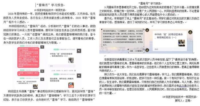 在我院团委的号召下,我院各团支部通过手机、电脑、电视等平台在线上进行了“雷锋精神”的学习,这其中包含:“习近平对北京大学援鄂医疗队全‘90后’党员的回信内容”,我校校园网和我院微信公众号所推出的优秀毕业生和优秀工作者事迹,以及其他优秀工作者事迹等内容。