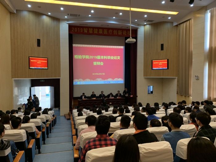 为检验人才培养质量和效果,强化实践教学基地标准化建设,推进专业改革和内涵建设,4月27日,我院举办了2019届本科毕业生论文答辩。答辩开幕式在逸夫科技楼学术报告厅举行,党委副书记、院长章尧出席开幕式。安徽医科大学第一附属医院检验科主任徐元宏、第二附属医院检验科主任管世鹤,安徽省立医院检验科主任王保龙,安徽中医药大学第一附属医院检验科主任黄开泉,蚌埠医学院第一附属医院检验科副主任郭晖、第二附属医院检验科主任金齐力,安庆市立医院检验科主任胡安群,池州人民医院检验科主任胡义忠,宁波李惠利东部医院检验科主任吴巧萍、副主任李情操,南京儿童医院检验科主任陈红兵,芜湖市第二人民医院检验科主任肖敏敏,宁波美康生物科技股份有限公司技术总监戎奇吉,芜湖市疾病预防控制中心主任程周祥、检验科科长郑妹凤,马鞍山市疾病预防控制中心副主任朱明、检验科科长陈道利,黄山市疾病预防控制中心副主任程韶光,安庆市疾病预防控制中心检验科科长刘敏洪,我校第一附属医院检验科主任李小宁、副主任武其文等20多名省内外医学检验和卫生检验专家,以及我院党政领导、全体教师和2019届本科毕业生参加了开幕式。开幕式由我院副院长浦春主持。