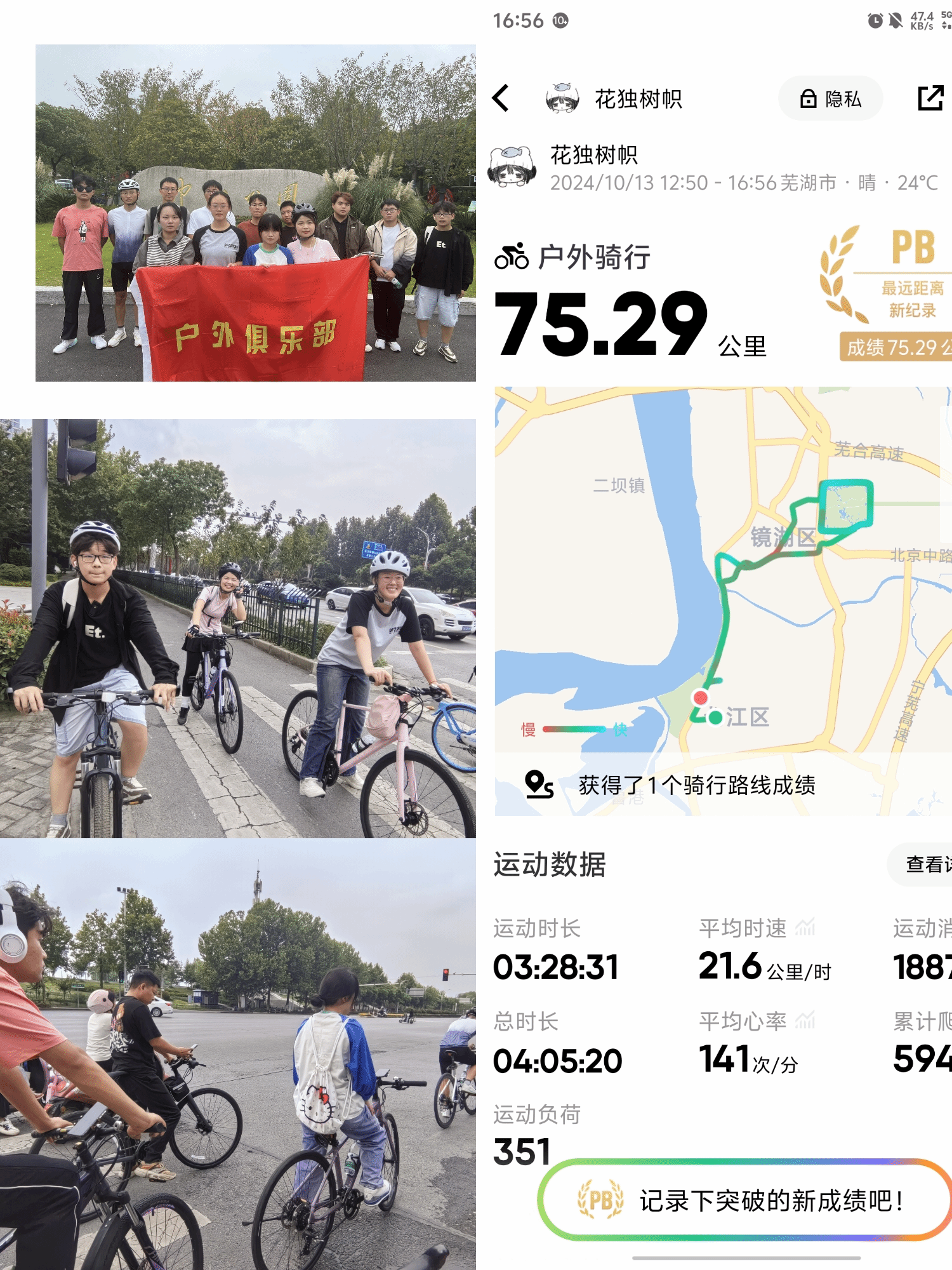 为共同庆祝中华人民共和国成立75周年,10月13日,户外俱乐部发起了“骑行绘盛世,共庆75周年华诞”活动,10名骑行爱好者组成了一支充满活力的车队,接力骑行75公里,他们以车轮为笔,以芜湖街道和神山公园为纸,用一场别开生面的接力骑行活动为祖国母亲献上了一份特别的生日礼物。