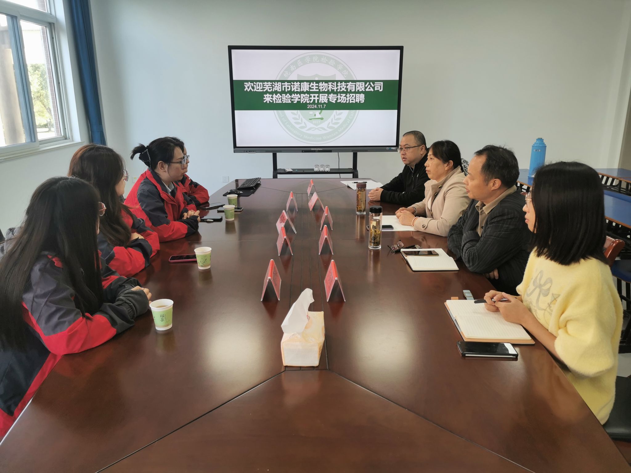 为促进2025届毕业生求职,为学生提供求职就业渠道,11月7日,我院邀请芜湖市诺康生物科技有限公司来校开展专场招聘,学院党委书记、副院长刘影,党委副书记、院长洪亮,毕业班辅导员和20余名2025届毕业生参加。
