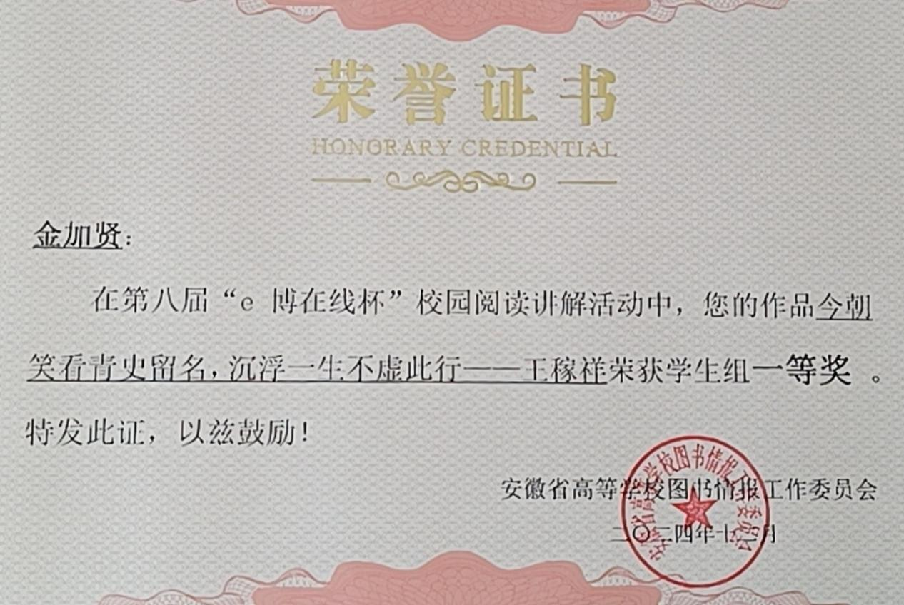 近日,由安徽省高等学校图书情报工作委员会主办、e博在线承办的第八届“e博在线杯” 经典共读·青春领航校园阅读讲解活动圆满落幕,我院学子2023级医学检验技术专业3班金加贤同学喜获一等奖。