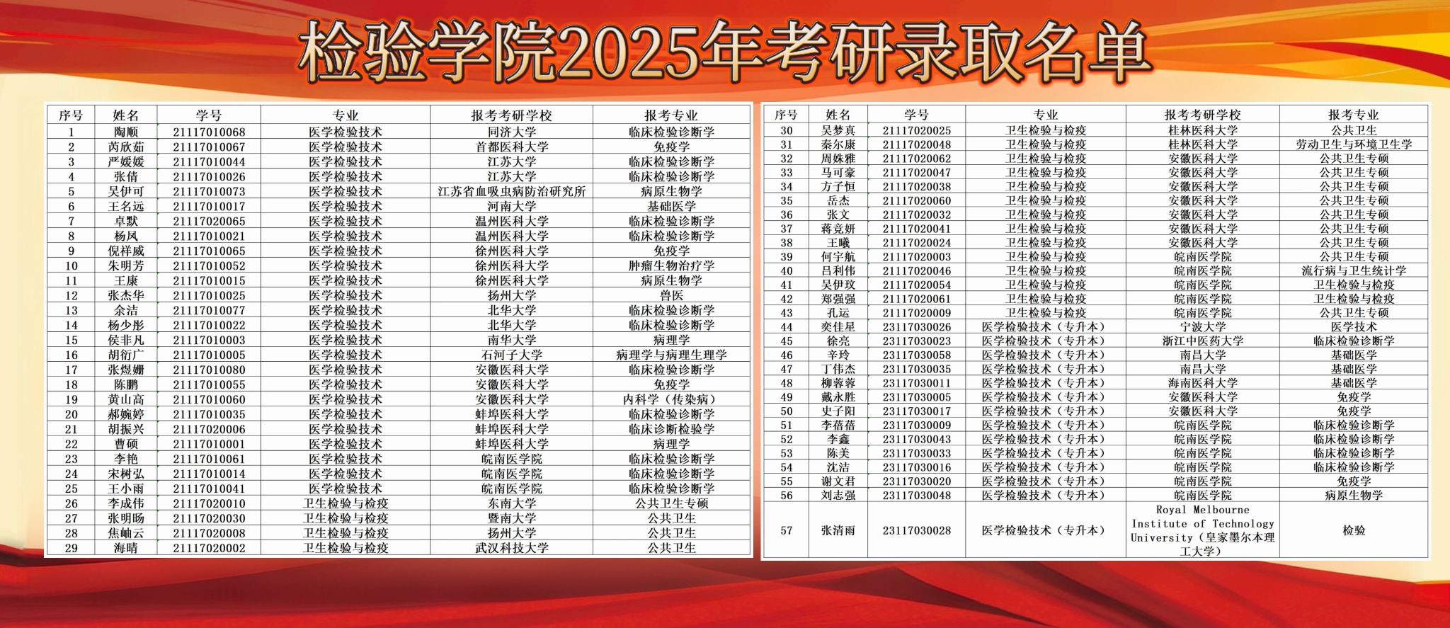 随着4月30日考研调剂系统的关闭,2025年研究生复试工作全面结束,我院2025届毕业生考研录取结果亮点闪烁。2025届毕业生共有186人,考研拟录取57人,其中境内升学56人,境外留学1人,升学率达30.65%,再创历史升学率新纪录。其中,2021级医学检验技术专业升学率为31.65%、2021级卫生检验与检疫专业升学率为38.30%,2023级医学检验技术(专升本)专业升学率为23.33%,也均为历史升学率最高纪录。