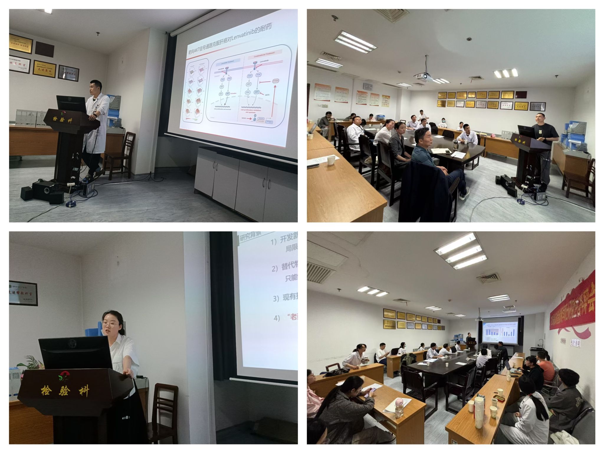 在科研汇报环节,一附院检验科严帅博士,在首期科研沙龙介绍类器官技术的发展历程和研究方法的基础上,以肝癌类器官生物库的精准医学研究为例,深入剖析了肝癌类器官在模型构建、药物筛选和分子机制研究等方面的研究思路,分享了该团队前期在该领域的研究进展,并总结了现有研究方法,对后续的类似研究提供了重要的借鉴经验。二附院检验科秦明明介绍了非编码RNA在肿瘤中的作用和分子机制,探讨circ RNA/miRNA/mRNA调控网络在肿瘤生物学功能中的意义,为肿瘤的临床诊断和治疗提供了理论依据。卫生检验与检疫学教研室彭辽天博士分享了霉酚酸与ATP合酶抑制剂联合杀菌作用的相关研究,该研究突破抗生素在细菌治疗中的限制,为解决细菌的耐药性提供了新的治疗思路和方法。在交流环节,参会人员就相关研究展开深入讨论,并对接下来的深度合作表现出强烈的期待,现场气氛热烈。