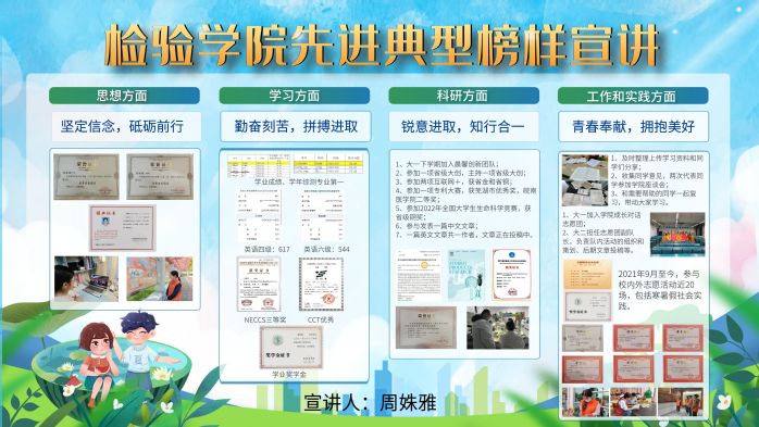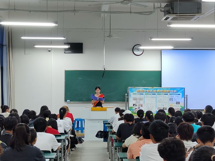 为帮助2023级新生更好地适应大学生活,充分发挥先进典型的示范带头作用,激励引导新生崇尚先进、学习先进,我院于9月20日晚在逸夫科技楼3104教室开展了先进典型宣讲活动。宣讲由近两年学业成绩和综合测评成绩均为专业第一的2021级卫生检验与检疫专业周姝雅同学主讲,全体2023级新生参加。