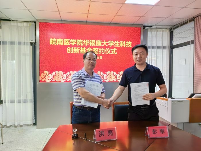 仪式上,彭军和洪亮分别代表企校双方在协议书上签字。根据协议,安徽华银康医学检验所有限公司在我院设立大学生科技创新基金,基金每年资助3万元、资助人数10人,用于大学生开展科学研究活动。